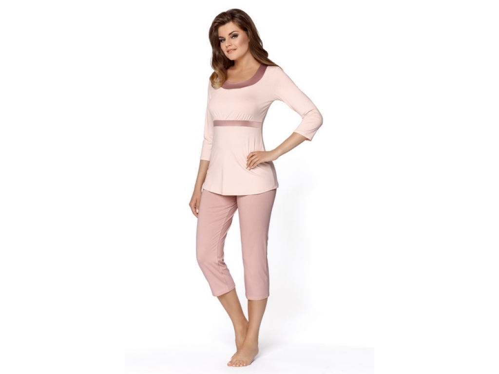 Elegantné, krásne a pohodlné dámske pyžamko z kvalitnej viskózy. Horný diel ma 3/4 rukáv a okolo krku a pod prsiami je elegantne zdobený jemným saténovým lemom. Nohavice majú klasicky hladký strih, v páse na gumičku a 3/4 dĺžku.