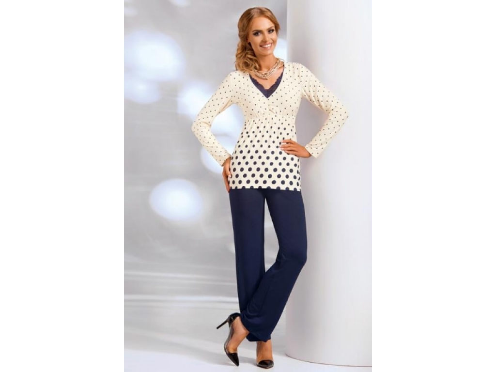 Elegantné, krásne a pohodlné dámske pyžamko z jemnej viskózy. Horný diel stiahnutý medzi a pod prsiami, vďaka čomu budete vyzerať a cítiť sa krásne aj v noci. V-éčkový strih je zdobený tmavomodrou krajkou. Nohavice majú klasický hladký strih, v páse na gumičku.