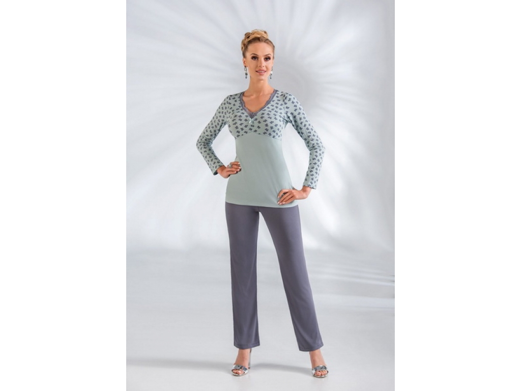 Elegantné, krásne a pohodlné dámske pyžamko z jemnej viskózy. Horný diel stiahnutý medzi a pod prsiami, vďaka čomu budete vyzerať a cítiť sa krásne aj v noci. V-éčkový strih je zdobený jemnou krajkou. Nohavice majú klasický hladký strih, v páse na gumičku.