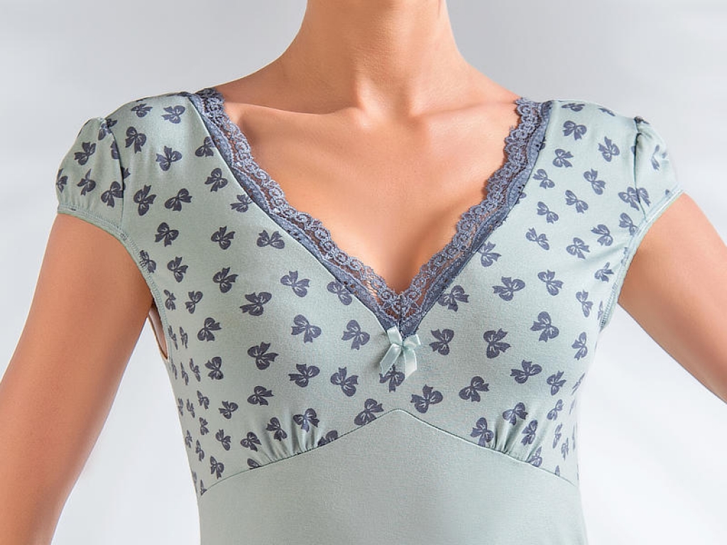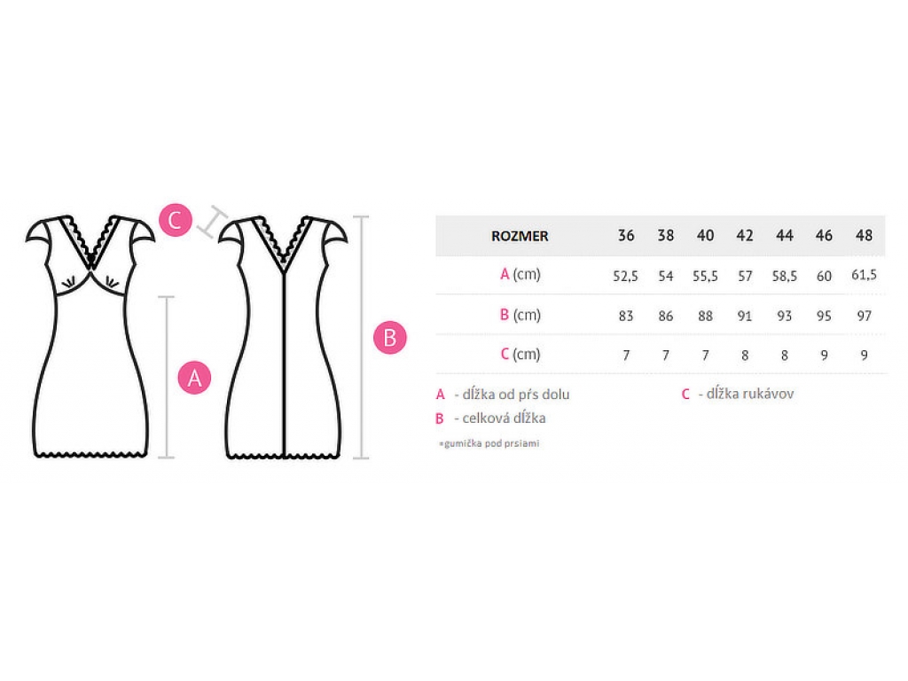 Elegantná, krásna, sexi a pohodlná dámska nočná košieľka z jemnej viskózy. Horná časť je stiahnutá medzi a pod prsiami, vďaka čomu budete vyzerať a cítiť sa krásne aj v noci. V-éčkový strih je zdobený jemnou krajkou. Dĺžka podľa priloženej tabuľlky.